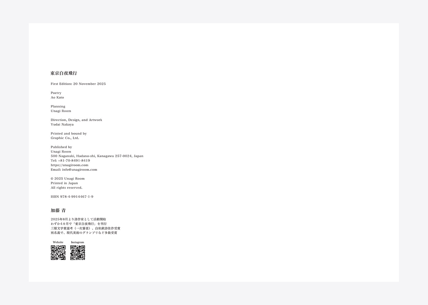 PUBLICATIONS 芸術と詩の書籍 美術図録 CURATED ARTWORKS 2024 – 2025 中谷 優大 ¥1,100 (tax included) 30 pages│182mm×257mm Released on 2025.11.10 詳細はこちら 詩集 東京白夜飛行 加藤 青 ¥1,100 (tax included) 52 pages│130mm×182mm Released on 2025.11.30 詳細はこちら COMPANY 芸術と詩で人生を彩る 事業名 Unagi Room 運営 Phiria Design 営業時間 10:00~18:00(土日祝日を除く) 本社 〒257-0024 神奈川県秦野市名古木500 責任者 中谷 英子 設立 2025年09月01日 資本金 10,00,000円 事業内容 書籍・雑誌・電子書籍の企画、編集、制作、出版および販売に関する業務 主要銀行 三菱UFJ銀行 中屋 優大